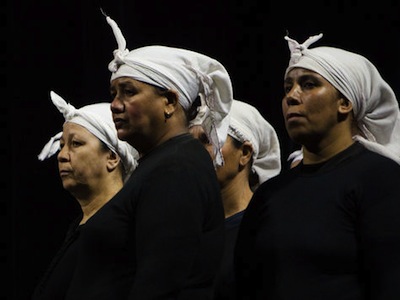 Sous le soleil encore puissant d’un bel après-midi d’automne, sur l’esplanade du Musée des Confluences, quelques minutes auparavant, l’arrivée de ces femmes tout de noir vêtues, les cheveux ramassés sous des fichus blancs, avait imposé le silence. Programmée dans le cadre de la 17ème Biennale de la Danse, cette performance présentée pour la première fois à la Biennale Art in Marrakech en 2014, a investi plusieurs espaces de la ville. La perspective est ouverte qui surplombe le Rhône. Le geste performatif s’inscrit entre le ciel dégagé et l’architecture de béton et de verre. La présence de ces femmes semble consacrer l’endroit. Elles s’y disséminent selon une science sécrète, marquent chacune un point sensible, autant de nœuds d’un tissage à la fois simple et complexe, elles font face aux différents points cardinaux. Pour la plupart, elles sont très jeunes, habitantes de Lyon, ayant participé aux ateliers donnés par Bouchra Ouizguen. Quant aux plus anciennes, performeuses issues de la tradition des Aïtas au Maroc, elles collaborent avec la chorégraphe depuis sa pièce unanimement saluée en 2010, Madame Plaza. Il y était déjà question de voix, de chants et de traditions des femmes. Créée en 2012, HA ! approfondissait cette recherche, l’orientant davantage du côté des rituels de transe menés par des confréries Issawas. Corbeaux s’inscrit dans cette lignée, comme son pendant imaginé pour l’espace public, à même de relever le pari de la lumière du jour, du manque absolu d’artifices et de l’inscription dans le tissu urbain.