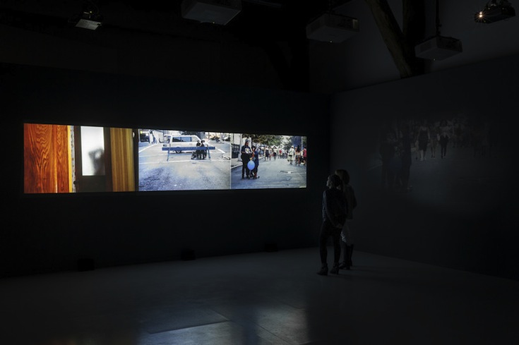 Le régime des images devient fantomatique, dessine des polyphonies fragiles, au bord de l’évanouissement, telles ces ombres sur le sable d’un rivage ou ces silhouettes floues dans le clair-obscur d’un appartement familial. Bourdonnement sourd, lignes de basse continues, les tensions ici / là-bas, présence / absence, sphère domestique (la cuisine de sa mère) / sphère publique ou encore médiatique (après la victoire de Barack Obama), déplacement / renfermement, sont plus que jamais évidentes, dans les espaces flottants, qui intiment de multiples circulations entre les écrans de l’installation Maniac Shadows, déployée de manière inédite au rez-de-chaussée du Centre d’art contemporain La Ferme du Buisson. Figées sur un mur qui aligne une mosaïque de vidéogrammes, labouré par autant de temps en suspens, répétitions et motifs qui se font écho de New-York à Tel-Aviv en passant par Bruxelles et Paris, les images deviennent impossibles dans l’installation Marcher à côté de ses lacets dans un frigidaire vide, fruit d’un atelier de création radiophonique en 2008, d’une certaine manière alpha et oméga de l’exposition. Les voix résonnent dans l’espace, évoquent d’autres présences, d’autres époques et d’autres lieux, avec leurs joies menues et leurs horreurs. La condition de la femme et la Shoah hantent cette conversation à demi-mots entre une fille et sa mère, ayant comme point de départ le journal intime, écrit en langue polonaise alors qu’elle était adolescente, de la grand-mère disparue dans les camps, et dont la première phrase dit littéralement : « je suis une femme donc je ne peux pas… »