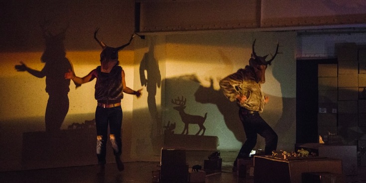 Autour du foyer central, des silhouettes affublées de masques de cervidés sont désormais en train de danser. Les pieds nus martèlent sur la dalle de béton des pas intemporels, avant que le rythme ne s’accélère, en mue vers des pulsations électro débridées. Sur les parois laiteuses, les ombres se mélangent, comme une annonce prématurée de la lumière de l’aube. Des murs en carton s’écartent, l’effet de surprise est garanti : sous les couleurs acides d’un club de nuit aux fréquentations douteuses, la scène mythique de l’Homme Oiseau, dans le Puits s’ouvrant au fond de l’Abside de Lascaux vers le réseau inférieur, n’a de cesse de recommencer.