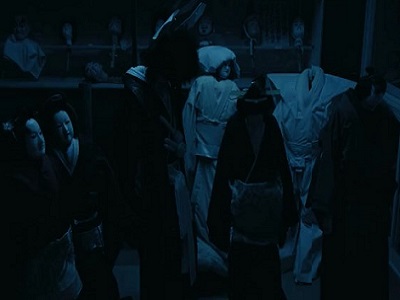 Le second volet est un travail plus documentaire : cette fois nous rentrons réellement dans l’espace scénique, mais aussi dans ses coulisses, mêlant la représentation et son envers, le récit et sa répétition. Le bunraku propose lui-même dans sa forme de voir l’envers et l’endroit de la représentation : le marionnettiste est visible derrière sa marionnette, bien que vêtu de noir pour se fondre le plus possible dans le décor, il reste une présence agissante et perceptible. La lumière est ici aussi un des acteurs principaux du film, comme dans le premier elle modèle l’espace nocturne et les intérieurs, leur confère une dimension quasi fantomatique évoquée par le titre : les « kitsune-bi » (« feu de renard ») sont des feux follets produits par le souffle des renards, créatures qui incarnent bien la duplicité dont jouent ces films.