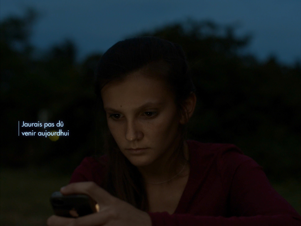 La partie médiane du film rappelle à notre souvenir l’ultime séquence d’Un jeune poète, où l’apparition d’un texte à l’image produisait un sentiment désagréable dans l’adresse qu’il faisait au protagoniste, sommé de mener à bien la mission qu’il s’était fixé alors que l’aboutissement de son parcours le laissait dans une impasse. L’intervention par ce biais d’une entité complètement abstraite (sont-ce les poètes sous leurs tombes ou le réalisateur lui même qui apostrophent le jeune homme ?) ne manquait pas de produire un effet de surplomb, mettant définitivement le personnage à terre. Manivel reprend peu ou prou la même idée dans Le Parc, sauf qu’ici la violence de l’apparition du texte à l’image prend un tout autre sens en s’appuyant sur un geste concret et en attribuant un auteur au texte. Alors que la nuit tombe sur le parc, la jeune fille restée sur sa colline dans l’attente d’une réponse au texto qu’elle avait envoyée au garçon après son départ, engage avec lui un dialogue à distance et par sms interposés, apprenant avec désarroi de la part du jeune homme qu’il ne peut pas sortir avec elle car il est encore engagé dans une autre histoire d’amour. Dans l’immobilité et le silence de cet impressionnant plan-séquence, une deuxième chorégraphie se déploie à son tour, rythmée par l’apparition des textos et par le temps d’attente entre chacune des réponses, ainsi que par le déclin progressif de la lumière sur le visage de l’actrice, l’incroyable Naomie Vogt-Roby.