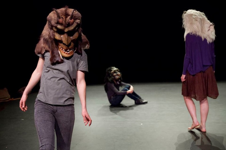 Elles sont déjà là, sur le plateau, plongé dans l’obscurité, alors que le public s’installe. Des sons de cloches résonnent de manière éparse, appels des grands espaces ouverts des hauts alpages. Trois êtres indéterminés se tiennent à la lisière du visible, volumes opaques et mystérieux sous de lourdes peaux de bêtes, au poil long et doux, crépu ou encore rêche et dru. Les visages se refusent aux spectateurs. Les regards resteront obstinément tournés vers un ailleurs qui s’affranchit de la simple localisation géographique — au creux des Alpes Valaisannes, dans la haute vallée où les trois protagonistes ont rencontré les porteurs des masques Tschäggättä — pour faire signe vers un espace intérieur, lieu de latence et de débordement.