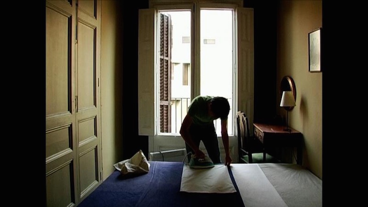 Nous suivons Marco dans ses tâches quotidiennes, au sein de la pension pour touristes dont il est l’unique employé. Contraint de tout prendre en charge (accueil des clients, ménage dans les chambres, etc.), il travaille constamment, douze heures par jour, sept jours sur sept, disposant d’un placard de quatre mètres carrés pour dormir. Dès les premiers plans, sa parole, recueillie au cours d’échanges avec la cinéaste, se superpose aux scènes de travail. La douceur de sa voix et la nature philosophique, voire poétique de certains de ses propos contrastent avec la dureté, la pauvreté de ses conditions de vie. Le film, composé de longs plans fixes, nous inscrit dans le rythme de ces journées de labeur interminables et répétitives. C’est un formidable document sur le corps au travail, corps-machine qui est aussi un corps-refuge. Marco, qui accomplit mécaniquement et silencieusement toutes les corvées qui lui sont assignées, semble s’être retiré, enfermé dans cette série de gestes sans fin. À tel point qu’il lui est difficile de s’interrompre lorsque la cinéaste tente d’engager un dialogue avec lui.