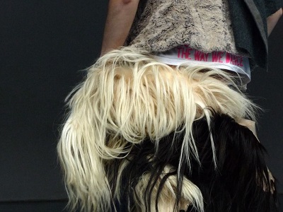 Lucie Eidenbenz: Au début, nous ne voulions pas être nous mêmes sur scène, nous voulions laisser la place aux gens, mais, au fur et à mesure de l’avancement du projet, nous nous sommes rendues compte que tout se ramenait tellement à nous et à notre rapport à ce que nous cherchions que finalement, être sur scène avait du sens. Nous étions porteuses de cette expérience là et nous pourrions la traduire. Cela s’est fait de manière assez organique. Cette expérience nous avait également transformées. Peut être étions nous parties avec l’intention de montrer quelque chose d’extérieur à nous et finalement c’était plus intéressant de montrer comment cette recherche a changé quelque chose en nous, comment nous avons traversé ce processus, comment nous trois, nous partageons cette expérience avec les deux adolescentes aussi.