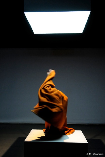 Le chorégraphe imagine tout d’abord un dispositif. Les chanteurs qu’il invite pour cette création prennent place en haut des gradins. Les spectateurs occupent ainsi la place du coryphée dans le théâtre antique, sont pris en tenaille, au mitan d’un espace de résonance marqué par une ample circulation des voix et des énergies. Incantations, litanies, louanges, interpellations fusent ou crépitent dans la salle, agissent sur l’entité sans visage qui se tient hiératique au centre du plateau. Des bruits viscéraux, amplifiés de manière troublante, émanent de ce corps éminemment sonore. Vincent Dupont poursuit depuis plusieurs années un travail exigent sur le souffle et sur la voix. Les textes de Charles Pennequin accompagnent souvent ses créations. Pour Air, le poète conçoit des saccades, des contorsions hypnotiques, des interférences et des chevauchements des sens. Oraisons et polyphonies vertigineuses tissent des paysages surprenants dans cet espace respiratoire commun. Les spectateurs sont engloutis dans les limbes d’un territoire entre. La moindre vibration de l’air est une invitation à s’enfoncer dans un état de conscience modifiée. L’entité qui magnétise l’attention au centre du plateau déploie les puissances de l’informe, se dédouble, se laisse agir par la musique. Les membres se raidissent, les corps se figent, des pantins au regard vitreux assument des fonctions divinatoires à travers des questions lancées à l’audience. La lumière blanche et irréelle au départ change subrepticement de nuance et d’intensité, transcrivant de fuyantes sautes d’humeurs jusqu’au rouge sanglant d’un sacrifice sublimé. L’espace même semble se rétrécir sous la pression de forces innommées qui rodent et heurtent la paroi. Vincent Dupont excelle à semer le doute, à changer d’échelle et de niveau de lecture, à brouiller les pistes – qui agit qui/quoi ? Les partitions si codées des transes de possession deviennent floues. Les deux corps semblent se fondre dans une même entité tiraillée par des forces divergentes. Entre la production du son et la recherche d’une qualité de mouvement bien particulière, un certain flottement persiste et rend les danseurs davantage insaisissables. Ils n’ont pas encore atteint l’endroit où la transe pourrait opérer, mais ils n’en sont pas bien loin.