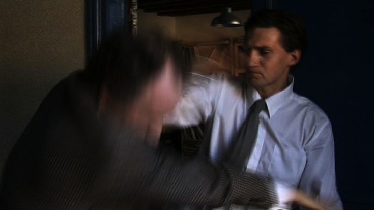 Nous sommes de toute évidence entourés par de nombreuses petites morts, qui attendent notre chute et gagnent du terrain à la moindre inattention de notre part. Le second moment du film, intitulé « L’investissement », qui met en scène deux hommes qui luttent, au sens propre, parce qu’ils ont des objectifs divergents, le montre de manière particulièrement puissante, en travaillant le même principe de répétition. Ce motif d’une situation dont l’absurdité est reprise ad nauseam est poussé plus loin encore, car il se déploie dans un régime d’expression qui interdit toute mise à distance. Un homme veut rentrer chez son voisin et le lui dit. C’est une idée fixe. Le voisin pour sa part met tout en œuvre pour l’en empêcher. Le simple fait que quelqu’un souhaite entrer chez lui, sans autre forme de procès ni justification extrinsèque, pose ce désir exprimé par l’étranger comme une agression. La scène est filmée caméra à l’épaule, tantôt sur le pallier, tantôt depuis l’intérieur de l’appartement. Elle capte un phénomène d’amplification de la violence qui devient presque mécanique, quand une conscience obstinée rencontre un alter ego non moins campé sur ses positions. Ce n’est plus par le langage que la violence se manifeste, mais par des actes. Les coups tombent sur l’étranger qui veut entrer dans l’appartement. Pour seule réponse, il glisse son pied contre la porte de son voisin pour empêcher ce dernier de la refermer. C’est le grain de sable qui détraque la machine sociale. Nous ne sommes pas dans la logique d’un donné pour un rendu. La violence croît selon ses propres ressources et un régime interne, d’elle-même, de la même manière qu’un investissement qui fonctionne ne peut que provoquer un investissement supplémentaire, qui viendrait assumer le précédent tout en montrant qu’il peut et doit être plus ambitieux et plus vaste. Chaque ruade appelle ainsi une nouvelle charge de coups sur le pauvre homme, lequel a toujours les dernières forces requises pour empêcher la porte de se refermer. Si le principe de répétition est ici encore à l’œuvre, la violence qui se dégage ne reste pas identique à elle-même. Sa répétition modifie nécessaire son quantum, tant et si bien que le malaise éprouvé devient à chaque moment plus précis, à la limite du supportable. Car ce qui se joue ici se pose en dehors de toute question de légitimité morale ou autre. La situation est donnée, claire en elle-même, et la présence de la caméra au milieu de la scène nous fait toucher du doigt que l’expérience ne pourra guère s’interrompre tant que la porte ne se sera pas refermée.