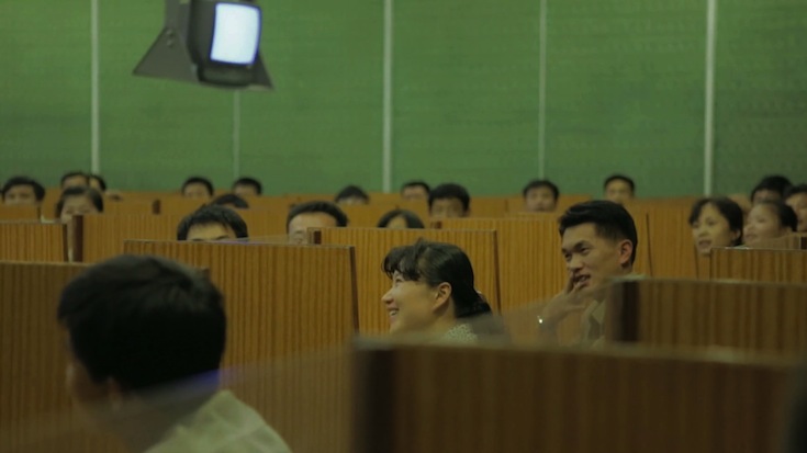 Tourisme international est un film de et sur la contrainte. Il rend compte d’une expérience limite : un voyage touristique dans une des dictatures les plus violentes et les plus fermées du monde, celle de la Corée du Nord. Marie Voignier a accompagné un groupe de touristes (qui apparaissent régulièrement dans le cadre, toujours munis d’un appareil photo) dans sa visite du pays, ou plus exactement de sa version Potemkine : bibliothèques, musées, grands spectacles chorégraphiques et même studio de cinéma… La première contrainte est donc celle d’une position imposée à la caméra, position du touriste sommé de voir ce que le régime accepte de montrer. La seconde s’exerce sur ceux qui sont filmés, les guides et interprètes (souvent des femmes) dont les discours sont là encore dictés et surveillés par le pouvoir central. Raison pour laquelle Marie Voignier ne les restitue jamais directement. Tourisme international est un film muet, dont la bande sonore, qui semble coïncider avec les faits et gestes observés à l’écran, est entièrement reconstituée, tandis que des cartons nous livrent des informations sur les lieux visités, les personnes rencontrées ou les situations vécues.