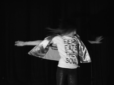 Les corps, qui prennent une connotation vibrationnelle et rythmique, et se métamorphosent en générateurs rythmiques et sonores, cèdent le pas à la figure humaine des musiciennes ou du public d’un concert rock. Une énergie féroce, chaotique, sauvage, pure puissance aux formes flexibles se déploie alors. Les corps semblent produire quelque chose autour et se tenir toujours à l’extérieur – des sons, des trajectoires, des traces — ils ne renvoient jamais à eux même. L’interaction entre les deux danseuses prend parfois des allures de confrontation, où l’énergie devient presque violente, où toujours les corps essaient de dépasser leurs limites, jusqu’à la transe, notamment dans les tours vifs et rapides de Lucie qui évoquent les derviches tourneurs, ou dans les secouements d’Adina qui rappellent quand à eux des shakers… en cherchant la limite ils prennent le risque de la chute, de la blessure, de l’ek-stase.