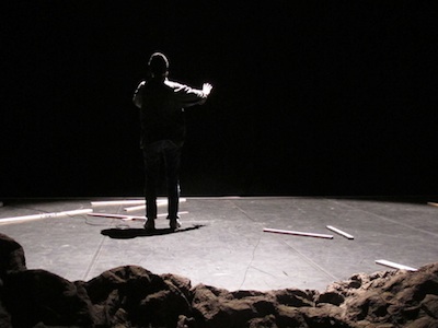 Un micro relié à une machine de distorsions, des lattes en bois, tout est déjà là, sur le plateau, offert, en vue, mais la création de Nina Santes s’emploie patiemment à creuser les failles du regard, lui joue des tours, déploie subrepticement d’étonnantes plages sensorielles.