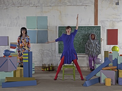 Balles colorées, briques empilées dans des architectures fragiles, ballons de yoga, constituent autant d’environnements pour des œuvres vidéo B !RDBRA !N (ADDENDUM), 2012, ENDE (LIKE A NEW BEGINNING), 2014 et SIX TWELVE ONE BY ONE, 2013. Ces objets du quotidien matérialisent la relation, les allers-retours complexes entre le temps de la performance live et du tournage, le temps de l’image montée et les plages temporelles fluctuantes de l’expérience spectatoriale. Un article à part entière pourrait être dédié à chacune de ces vidéos qui mobilisent à chaque fois une nuée de références et tissent les lignes de fuite du travail d’Emily Mast.