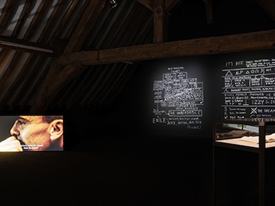 Le texte irrigue de sa force subversive les différents niveaux de l’exposition. Nous pourrions l’imaginer au bout de cette langue, énorme et aiguisée, en silicone, dérapage et crissement de pneu de vélo, gargantuesque, dans l’installation de Rainer Ganahl, I wanna be Alfred Jarry, 1897/2012. Les mots encore nous perdent sur les chemins troubles des Mad Marginal Charts de Dora Garcia, où l’artiste marque à la craie blanche à même le mur d’une chambre noire – conçue peut être par les deux curatrices, Keren Detton et Julie Pellegrin, comme l’inconscient de l’exposition – ses cosmogonies qui entretissent des références à Joyce, Lacan, Freud, Artaud, l’antipsychiatrie et la désinstitutionalisation. Le texte encore glisse vers le dessin, toujours chez Dora Garcia, quand elle lit Lacan, ou se charge de tout un potentiel cryptique et combinatoire dans les alphabets de Paul Chan, qui revisite les écrits du Marquis de Sade dans ses essais typographiques à la frontière des performances interactives sadiennes. La conjonction du texte et du corps s’expose dans les collages rigoureux et minimalistes de Henrik Olesen dans la série How Do I Make Myself a Body (2015), inspirée de l’histoire tragique d’Alan Turing, génie de l’informatique naissante et condamné pour homosexualité. Et quand le texte pressenti a des consonances bibliques, vernaculaires, cette même conjonction, donne leur consistance mutine et silencieuse aux marionnettes de Marvin Gaye Chetwynd, toujours en attente d’une activation live (Jesus and Barabbas puppet show performance/installation, 2011). Le temps est suspendu, les potentialités intactes.