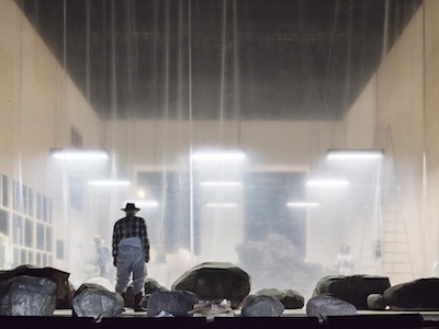 Nous voici basculer dans un univers où Philippe Quesne multiplie les articulations plastiques et conceptuelles, nourrit un dialogue avec la scène artistique contemporaine, tout en restant fidèle à ses processus de travail. La membrane transparente qui sépare les gradins de l’espace éclairé maintenant de manière clinique ne délimite pas une aire de jeu pour de machines autosuffisantes qui broient et crachent des cendres, comme dans le Sacre de Castellucci, mais un atelier où des humains en salopettes de travail s’affairent à peindre le décor, boivent du café, se laissent prendre par la musicalité d’un poème qui remonte à la surface.