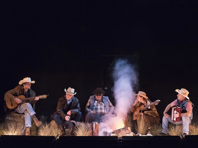Décélérer, écouter les chansons que les cinq interprètes partagent : un harmonica, une guitare, un petit accordéon, des brindilles qu’on craque pour attiser le faux feu de camp et des souvenirs improbables des films qu’on avait oubliés : « It’s time for a cowboy to dream » disent les vers. Une bande originale se déploie, portée par des voix aux timbres bien particuliers. D’autres paroles, d’une autre chanson, instillent le sentiment d’être chez soi – « home » – dans l’infinité du paysage de la frontière. Le cadre est posé, l’extension imaginaire de tout un pan du cinéma des années 50 et 60, irrésistible. Une mélancolie qui ne cache pas ses origines, menace d’éteindre son emprise. Fabriquée de toutes pièces par les industries culturelles, elle parvient néanmoins à se contaminer des résidus affectifs, réveille des échos, évoque furtivement La Mélancolie des dragons. La salle de théâtre semble devenir la caisse de résonance d’une faculté imaginaire, une machine cinématographique sans images qui s’emballe sous l’impulsion de stimuli contradictoires. Mais soudain le charme se brise. Ces cow-boys pas comme les autres souhaitent un « joyeux anniversaire ! » à l’un de leur paires qui troque sa veste ornée de lanières de cuir pour son cadeau, un sweat-shirt à capuche collector sur lequel la célèbre toile de Caspar David Friedrich est imprimée. La chanson qu’il entame d’une voix qui dénote, chancelante, encouragé par les vociférations de la petite assemblée, embrasse de manière méta-textuelle la pièce et raconte la pluie artificielle, le lever du rideau, la métaphore de la nature.