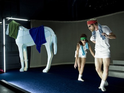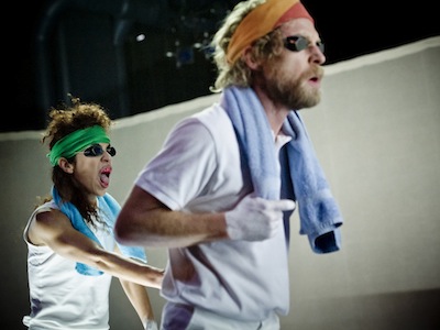 L’entrée dans la pièce se fait par le registre sportif, délimitant un domaine rassurant, anodin qui, tout en gardant des résonances agonistiques, entretient des liens avec le loisir, l’effort, la performance, la prouesse physique, la dépense gratuite et permet de moduler la nature des relations entre les deux protagonistes, entre la confrontation ouverte, la camaraderie et la complicité. Tout son attirail est néanmoins placé sous le signe d’une inquiétante étrangeté. Peignoirs blancs de sport ou de spa, casques de protection, bandana et socquettes de tennis, lunettes de piscine convoquent différents environnements et concourent à la construction de corps disparates, multiples, qui affirment d’entrée de jeu qu’ils vont mener la partie selon les exigences des médiums dissonants, à plusieurs niveaux et en suivant des règles hétéroclites. Nous voici propulsés dans les cycles de métamorphoses successives, auxquelles les deux danseurs s’adonnent avec une énergie furieuse. A chacun de suivre ses voies dans les territoires inextricables de Jaguar.