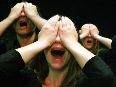 Loïc Touzé a toujours travaillé la potentialité, l’imaginaire cinématographique – pour Love –, personnel, en deçà de l’action uniformisante de tout apprentissage – pour La Chance. Pour cette nouvelle création, les mythes fondateurs de la civilisation occidentale constituent une matière brute, lourde de sens, mise en partage, offerte au devant du public, qui nourrit la corporéité des performeurs et la texture de leurs voix, qui stimule la faculté fictionnelle des spectateurs. Ô Montagne renoue avec des recherches plus anciennes. Le chorégraphe s’est déjà penché sur le travail de la figure et du corps – notamment dans une fine exploration de ce qui se situe en amont du geste – comme moteur de l’apparition des images. C’est maintenant la voix, à travers ses nuances, ses couleurs, ses timbres, qui produit du paysage. Foncièrement circonscrite au moment de sa manifestation, la voix déploie une terrible puissance d’actualisation des mythes, embrayeur d’imaginaire et véhicule de partage. Au premier abord brusque, déconcertante, tels ces cris dont les infimes modulations balaient dans un même souffle un spectre si large qui va de la jouissance aux lamentations, sa radicalité s’apparente au théâtre organique de Jerzy Grotowski. Qu’elle soit ou non articulée dans une parole, pour le coup éminemment performative, cette voix interpelle, agit de manière viscérale, remue. Son adresse engage à l’échange. En ouverture, dès le Prologue, Ondine Cloez nous convie à un acte d’attention simple mais essentiel, à une disponibilité aux choses qui deviennent de plus en plus abstraites, énormes, fines, insaisissables.