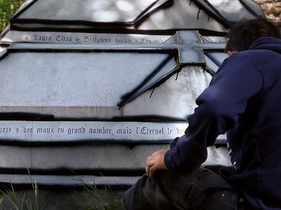 Beat Lippert : Dans Véhicule et Extase en aval, l'image a plutôt une fonction d'archivage. Pour Sepultura, il s'agissait véritablement d'organiser un tournage. J'ai écrit un séquencier sur la base de différentes performances faites par plusieurs artistes. J'ai aussi réalisé un storyboard. Mais c'est l'action qui est importante, celle de recouvrir les tombes de ce cimetière que j'avais dupliqué. A la base, c'était pensé un peu comme un workshop. C'est devenu un tournage parce qu'avec Donatella Bernardi, on avait des idées très précises de ce qu'on voulait faire. La vidéo qui en résulte est moins une narration qu'une succession de séquences qui montrent différentes actions, différentes manière d'agir face à cet objet qu'est la tombe.