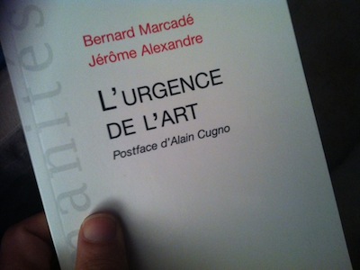 Jérôme Alexandre et Bernard Marcadé ont initié un échange épistolaire pour dire L'urgence de l'art. Son urgence, c'est-à-dire à la fois sa nécessité et l'immédiateté de son inscription dans le réel. Chacun selon ses compétences et selon ses aspirations — l'un est théologien, l'autre historien d'art —, les deux auteurs soulignent l'importance qu'il y a de comprendre l'art dans sa relation au présent tout en affirmant la totale indépendance des grands gestes qu'il engendre eut égard au contexte qui les voit naître.